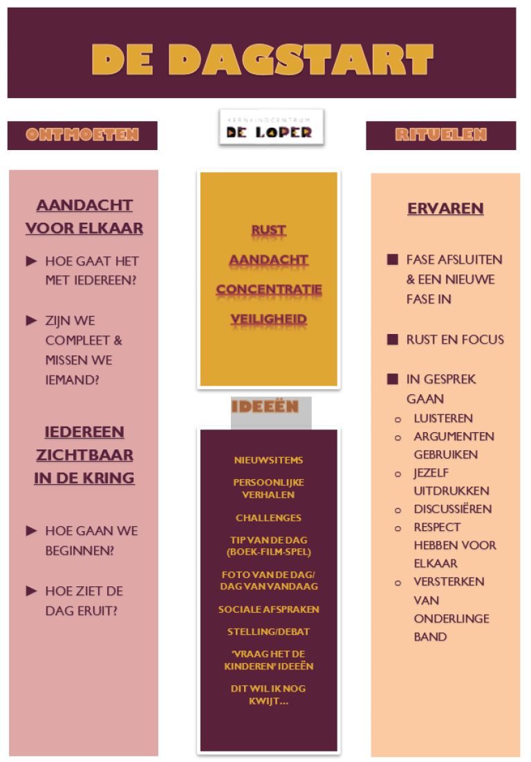 De dagstart wordt voorbereid en er worden vooraf bewuste keuzes gemaakt voor de inhoud. Toch is er net in de Dagstart ook ruimte voor spontane gesprekken. Er komen ook onverwachte en spontane verhalen op tafel die leiden tot prikkelende, inspirerende, filosofische en/of informatieve leergesprekken.